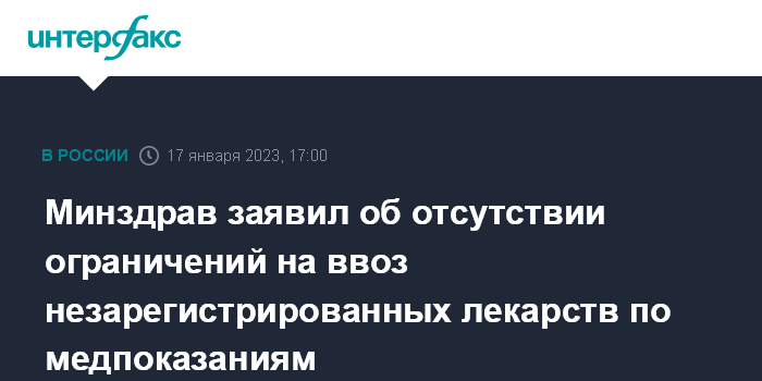Москва. 17 января. INTERFAX.RU - В России нет ограничений для ввоза необходимых пациенту, но незарегистрированных в стране лекарств; они могут быть ввезены в случае наличия медицинских показаний при назначении препаратов по решению врачебной комиссии, сообщили в пресс-службе Минздрава России.