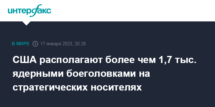Москва. 17 января. INTERFAX.RU - По данным на начало 2023 года США располагают 1770 развернутыми ядерными боеголовками на межконтинентальных баллистических ракетах шахтного базирования, стратегических подлодках и тяжелых бомбардировщиках, следует из данных американского Бюллетеня ученых-атомщиков.