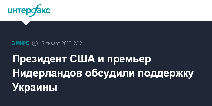 Москва. 17 января. INTERFAX.RU - Президент США Джо Байден и премьер Нидерландов Марк Рютте во вторник обсудили в Вашингтоне дальнейшую поддержку Украины, сообщает Белый дом.