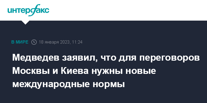 Москва. 18 января. INTERFAX.RU - Заместитель председателя Совета безопасности РФ Дмитрий Медведев считает одним из условий для проведения новых переговоров Москвы и Киева выработку системы норм, которые будут регулировать международные отношения в будущем.