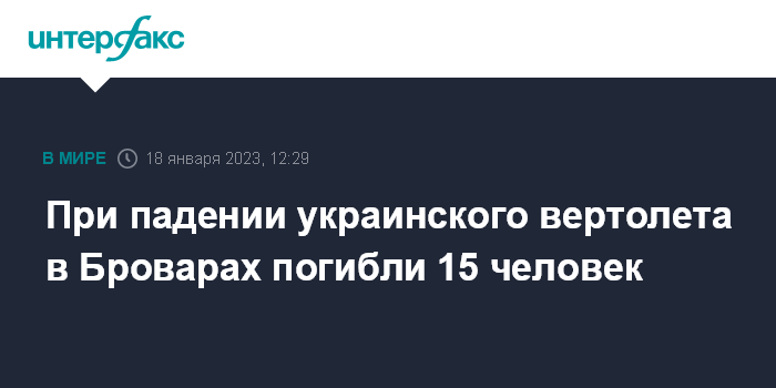 Москва. 18 января. INTERFAX.RU - В результате падения вертолета в Броварах Киевской области погибли 15 человек, сообщают украинские СМИ со ссылкой на главу национальной полиции Украины Игоря Клименко.