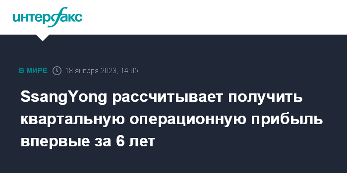 Москва. 18 января. INTERFAX.RU - Корейский автопроизводитель SsangYong Motor планирует отчитаться об операционной прибыли в четвертом квартале 2022 года благодаря росту продаж внедорожников, говорится в пресс-релизе компании.
