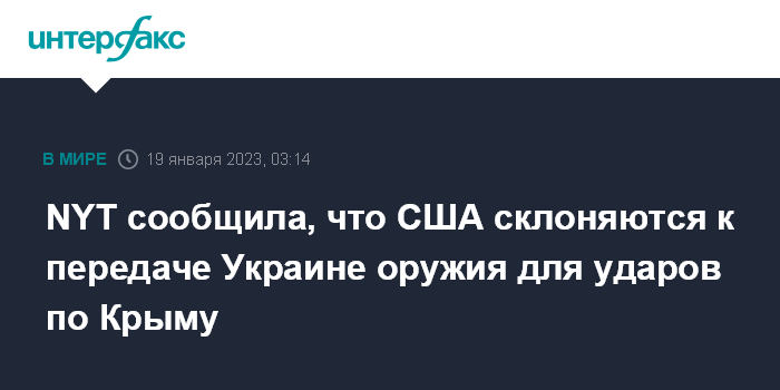 Москва. 19 января. INTERFAX.RU - Администрация президента США Джо Байдена склоняется к тому, что Киеву необходимо предоставить оружие для нанесения удара по Крыму, сообщает The New York Times со ссылкой на осведомленные источники.