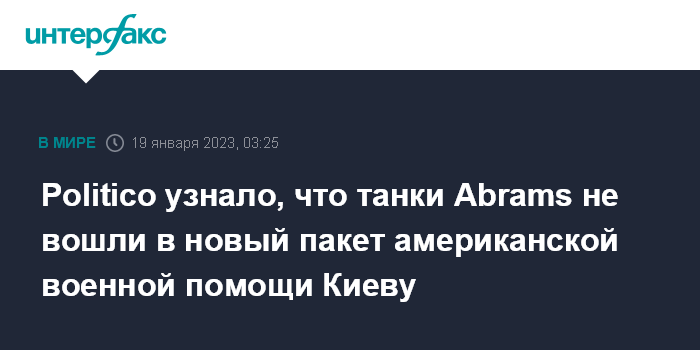 Москва. 19 января. INTERFAX.RU - Танки M1 Abrams не войдут в очередной пакет военной помощи Украине, о котором власти США планируют объявить в пятницу, сообщает Politico со ссылкой на осведомленные источники.