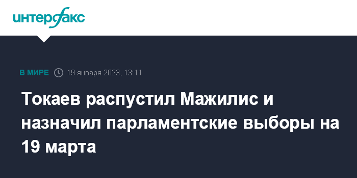 Москва. 19 января. INTERFAX.RU - Президент Казахстана Касым-Жомарт Токаев своим указом распустил нижнюю палату парламента - Мажилис, и назначил внеочередные выборы на 19 марта.