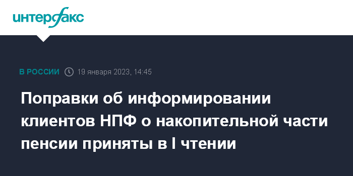 Москва. 19 января. INTERFAX.RU - Госдума приняла в первом чтении правительственный законопроект, который наделяет граждан, сформировавших накопительную часть пенсии в негосударственных пенсионных фондах, правом через Социальный фонд получать информацию о размере пенсионных накоплений.