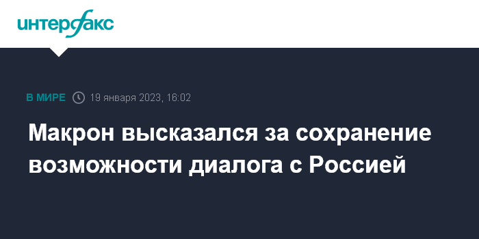 Москва. 19 января. INTERFAX.RU - Президент Франции Эммануэль Макрон считает, что нужно сохранять возможность диалога Запада с Россией, и не видит в этом противоречия с поддержкой Украины. Он сказал это в интервью El Pais, которое дал по случаю визита в Испанию.