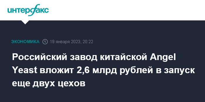 Москва. 19 января. INTERFAX.RU - ООО "Ангел Ист Рус" (принадлежит китайской Angel Yeast) до конца 2023 года введет еще два цеха на заводе Данкове в Липецкой области, объем инвестиций составит 2,6 млрд рублей, сообщил в Telegram глава региона Игорь Артамонов.