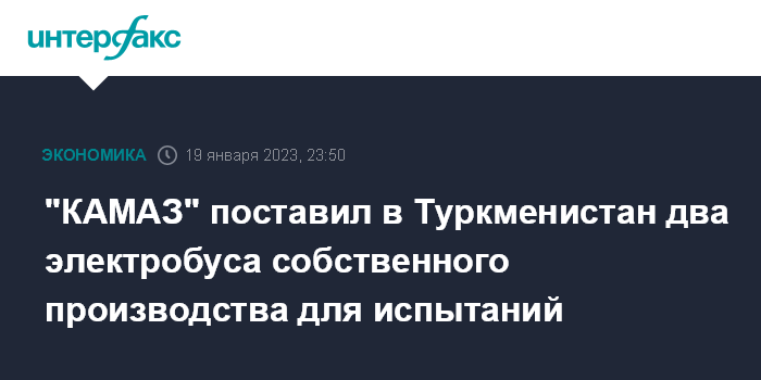 Москва. 19 января. INTERFAX.RU - "КАМАЗ" поставил два электробуса собственного производства для испытаний в Туркменистан, сказал журналистам генеральный директор "КАМАЗа" Сергей Когогин на Туркмено-российском бизнес-форуме, открывшемся в Ашхабаде в четверг, сообщает Туркменское информационное агентство Orient.