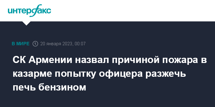 СК Армении назвал причиной пожара в казарме попытку офицера разжечь печь бензином