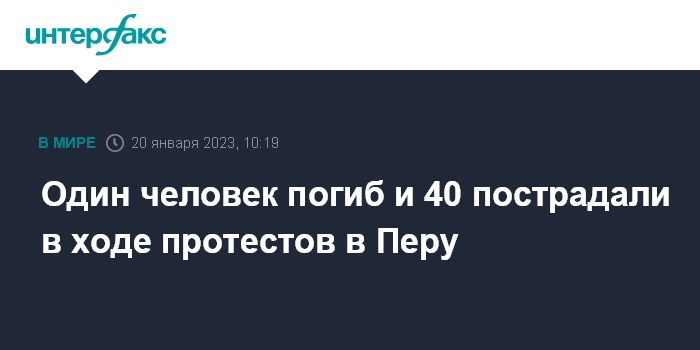 Москва. 20 января. INTERFAX.RU - В ночь на 20 января в Перу в столкновениях протестующих и полиции один человек погиб и около сорока получили травмы и ранения, сообщает радиостанция Radioprogramas del Peru. Беспорядки произошли в том числе в столице страны - Лиме.