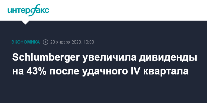 Москва. 20 января. INTERFAX.RU - Нефтесервисная компания Schlumberger в четвертом квартале 2022 года увеличила чистую прибыль и выручку, причем скорректированная прибыль и выручка превзошли прогнозы аналитиков. На этом фоне руководство компании решило увеличить квартальные дивиденды.