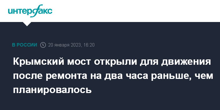 Москва. 20 января. INTERFAX.RU - Крымский мост открыли в пятницу для движения транспорта по автодорожной части после остановки на несколько часов для ремонта, сообщает пресс-служба Минтранса РФ.