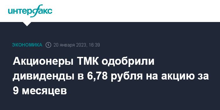 Москва. 20 января. INTERFAX.RU - Акционеры ПАО "Трубная металлургическая компания" (ТМК) одобрили дивиденды по итогам 9 месяцев 2022 года в 6,78 рубля на акцию, сообщила компания. Общая сумма выплат составит около 7 млрд рублей.