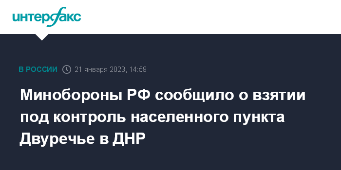 Москва. 21 января. INTERFAX.RU - Российские военные взяли под контроль населенный пункт Двуречье Донецкой народной республики (ДНР), заявил официальный представитель Минобороны РФ Игорь Конашенков.