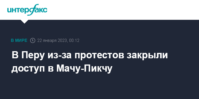 Москва. 22 января. INTERFAX.RU - Министерство культуры Перу закрыло на неопределенный срок доступ на территорию древнего города цивилизации инков Мачу-Пикчу, сообщает местное интернет-издание Peru21.