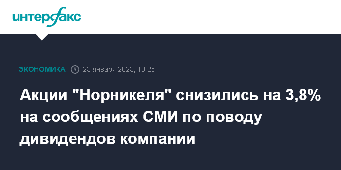 Москва. 23 января. INTERFAX.RU - Акции "Норильского никеля" снизились в начале торгов на Московской бирже в понедельник на 3,8% (до 14580 рублей за штуку) на сообщениях СМИ относительно рекомендаций размера дивидендов за 2022 год.