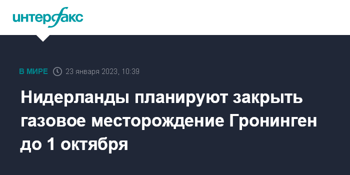 Москва. 23 января. INTERFAX.RU - Власти Нидерландов намерены закрыть крупнейшее в Европе месторождение природного газа Гронинген в этом году, поскольку считают опасной его дальнейшую эксплуатацию. Об этом заявил министр добывающей промышленности страны Ханс Вийлбриф в интервью газете Financial Times.