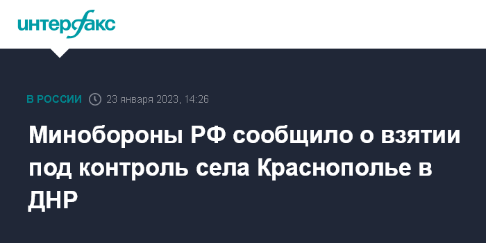 Москва. 23 января. INTERFAX.RU - Село Краснополье в Донецкой народной республике (ДНР) взято под контроль российских войск, заявил официальный представитель Минобороны РФ Игорь Конашенков.