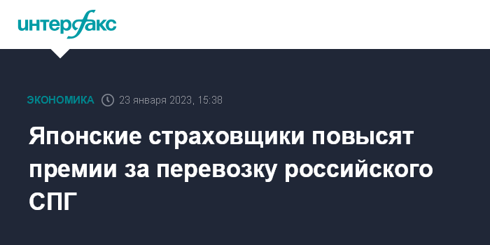 Москва. 23 января. INTERFAX.RU - Японские страховщики планируют увеличить страховые премии для судов, занимающихся перевозками сжиженного природного газа в территориальных водах России, примерно на 80% начиная со среды, пишет издание Nikkei.