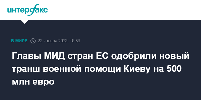 Москва. 23 января. INTERFAX.RU - Главы МИД государств-членов ЕС в понедельник согласились предоставить Украине новый пакет военной помощи на сумму 500 млн евро, сообщают европейские СМИ.