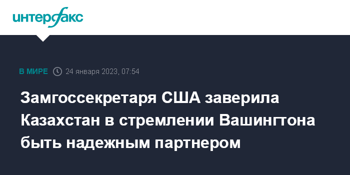 Москва. 24 января. INTERFAX.RU - Соединенные Штаты надеются на поддержание отношений партнерства и сотрудничества с Казахстаном как на двусторонней, так и многосторонней основах, заявила первый заместитель госсекретаря США Уэнди Шерман.