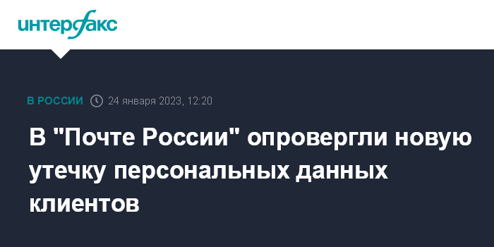 Москва. 24 января. INTERFAX.RU - Новый фрагмент базы с персональными данными клиентов "Почты России", попавший в открытый доступ, является компиляцией из других утечек, не относящихся к компании, сообщили "Интерфаксу" в пресс-службе "Почты России".