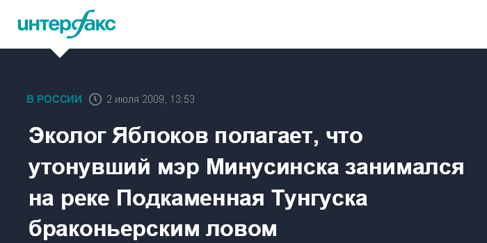 Москва. 2 июля. INTERFAX.RU - Мэр Минусинска Анатолий Кекин, утонувший в устье реки Подкаменная Тунгуска, скорее всего погиб во время незаконной рыбалки, считают в партии "Яблоко".
