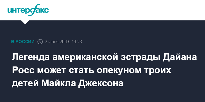 Москва. 2 июля. INTERFAX.RU - В завещании американского короля поп-музыки Майкла Джексона, составленного 7 июля 2007 года, говорится, что легендарная певица Дайана Росс должна взять опекунство над тремя его детьми, если его мать не сможет сделать это, сообщил в четверг британский телеканал "Скай-ньюс".