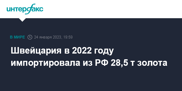Москва. 24 января. INTERFAX.RU - Швейцария в 2022 году импортировала из РФ 28,5 тонны золота на 1,57 млрд франков ($1,7 млрд). Об этом сообщили швейцарские таможенные органы.