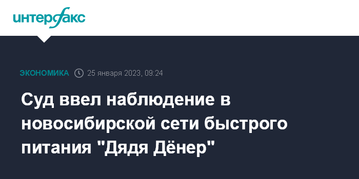 Москва. 25 января. INTERFAX.RU - Арбитражный суд Новосибирской области ввел процедуру наблюдения в отношении ООО "Дядя Дёнер" (Новосибирск, региональная сеть быстрого питания), сообщается в картотеке арбитражных дел.