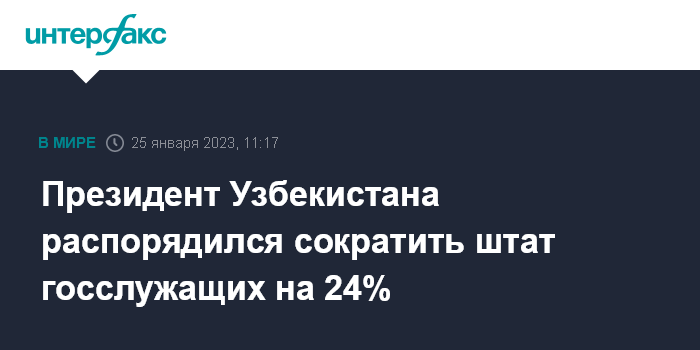 Москва. 25 января. INTERFAX.RU - Президент Узбекистана Шавкат Мирзиеев подписал указ, который подразумевает сокращение 17 447 государственных служащих, что составляет 24% их нынешнего числа, сообщили "Интерфаксу" в пресс-службе главы государства.