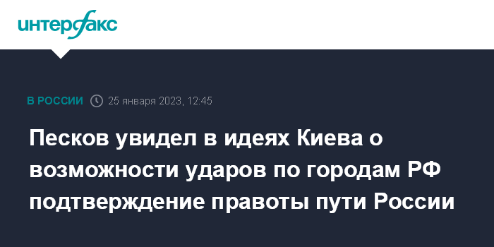 Москва. 25 января. INTERFAX.RU - Заявления представителей Киева о возможном нанесении ударов по городам России является подтверждением правильности избранного Россией пути и намерений оградить страну от такой опасности, заявил пресс-секретарь президента РФ Дмитрий Песков.