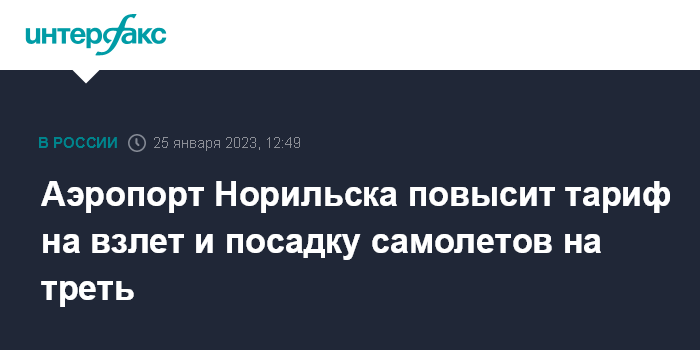 Москва. 25 января. INTERFAX.RU - ООО "Аэропорт "Норильск" (контролируется "Норникелем") с февраля повысит тариф на взлет и посадку в аэропорту "Алыкель" и тариф на обеспечение заправки самолетов на 35,2% и 40,5% соответственно, следует из приказа Федеральной антимонопольной службы, размещенного на портале правовой информации.