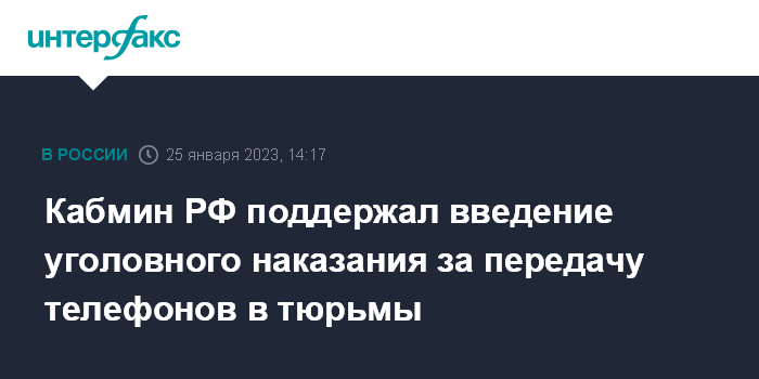 Москва. 25 января. INTERFAX.RU - Правительство поддержало законопроект о введении уголовного наказания за передачу мобильных телефонов в тюрьмы и колонии, сообщил председатель комитета Госдумы по информационной политике Александр Хинштейн.