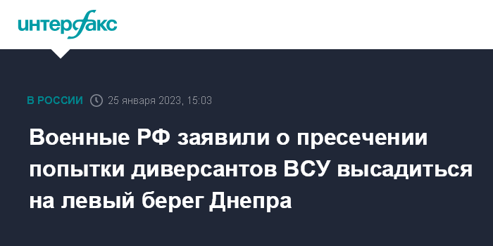 Москва. 25 января. INTERFAX.RU - В Херсонской области пресечена попытка Вооруженных сил Украины (ВСУ) переправиться для высадки диверсионно-разведывательных групп на левый берег Днепра, сообщил официальный представитель Минобороны РФ Игорь Конашенков.