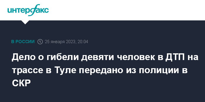 Москва. 25 января. INTERFAX.RU - Расследованием уголовного дела по факту автоаварии с гибелью девяти человек на трассе в Туле будет заниматься следственное управление СК России по Тульской области, сообщила пресс-служба ведомства.