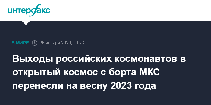 Москва. 26 января. INTERFAX.RU - Выходы российских космонавтов в открытый космос с борта Международной космической станции (МКС) перенесены на весну 2023 года, сообщил бортинженер миссии Crew-6 Андрей Федяев.