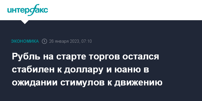 По мнению экспертов "Интерфакс-ЦЭА", рубль на старте торгов стабилен в ожидании новых стимулов к движению. Нефтяные котировки колеблются незначительно, мировые рынки капитала меняются разнонаправленно. Заметных событий на внешнеполитической арене нет, основные налоговые выплаты месяца завершены - осталось уплатить лишь налог на прибыль.