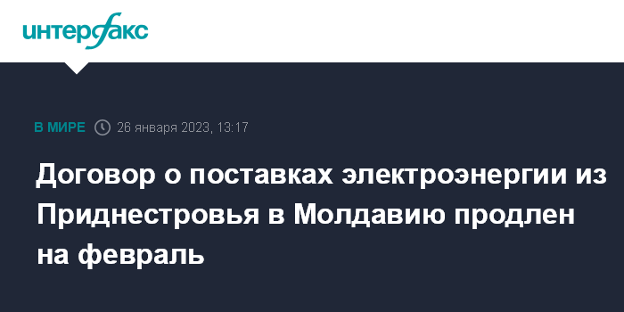 Москва. 26 января. INTERFAX.RU - Действующий договор о поставках электроэнергии из Приднестровья в Молдавию продлен на февраль 2023 года, сообщило в четверг министерство инфраструктуры и регионального развития Молдавии.
