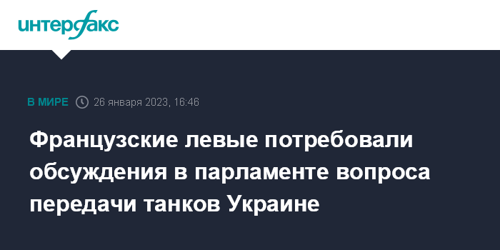 Москва. 26 января. INTERFAX.RU - Находящиеся в оппозиции французские партии левого толка выступили в четверг за то, чтобы власти не принимали решения по поставкам Украине танков Leclerc без обсуждения этого вопроса в парламенте.