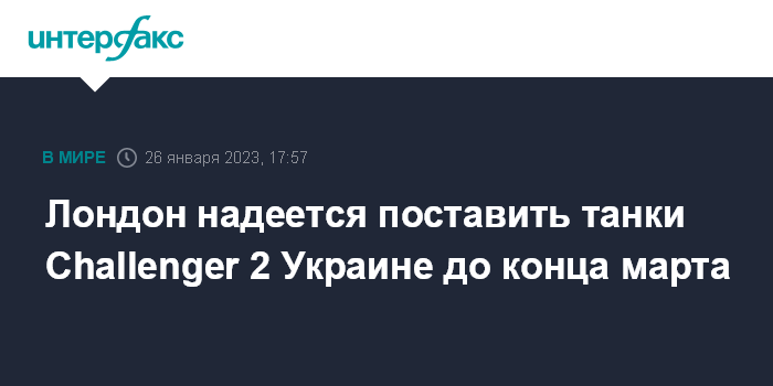 Москва. 26 января. INTERFAX.RU - Британские власти рассчитывают осуществить поставки Украине танков Challenger 2 до конца марта, заявил в четверг в парламенте замглавы Минобороны Британии Алекс Чак.