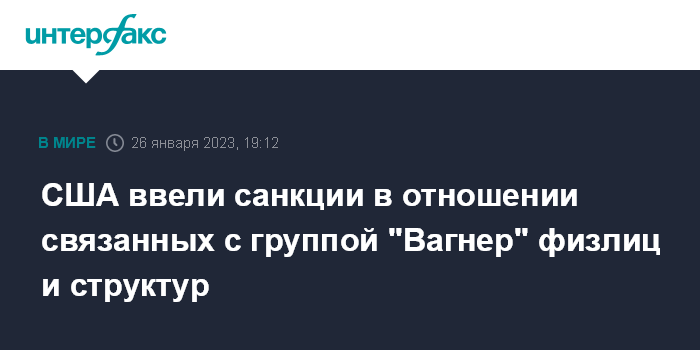 Москва. 26 января. INTERFAX.RU - Власти США отныне классифицируют группу "Вагнер" как транснациональную преступную организацию и вводят санкции против ряда физических и юридических лиц, имеющих, по утверждению Вашингтона, отношение к ней, говорится в пресс-релизе американского Минфина.