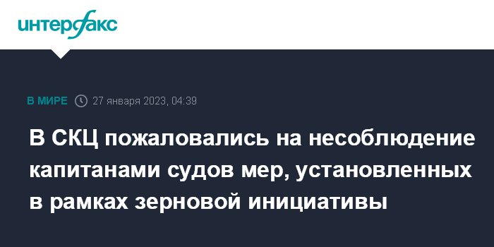 Москва. 27 января. INTERFAX.RU - Совместный координационный центр (СКЦ) сообщает о применении административных мер в отношении судов, нарушивших в течение последних трех дней требования, которые установлены в рамках зерновой сделки.