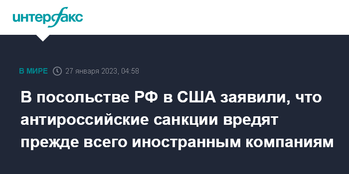 В посольстве РФ в США заявили, что антироссийские санкции вредят прежде всего иностранным компаниям