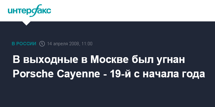 Москва. 14 апреля. INTERFAX.RU - В субботу ночью в центре Москвы был угнан еще один Porsche Cayenne, сообщил "Интерфаксу" источник в правоохранительных органах в понедельник.