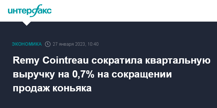 Москва. 27 января. INTERFAX.RU - Французский производитель алкогольной продукции Remy Cointreau SA незначительно сократил выручку в третьем квартале (октябрь-декабрь) продолжающегося финансового года на фоне снижения продаж коньяка.