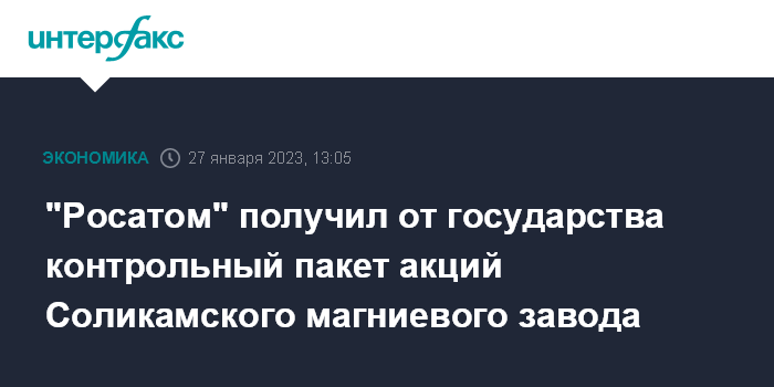 "Росатом" получил от государства контрольный пакет акций Соликамского магниевого завода