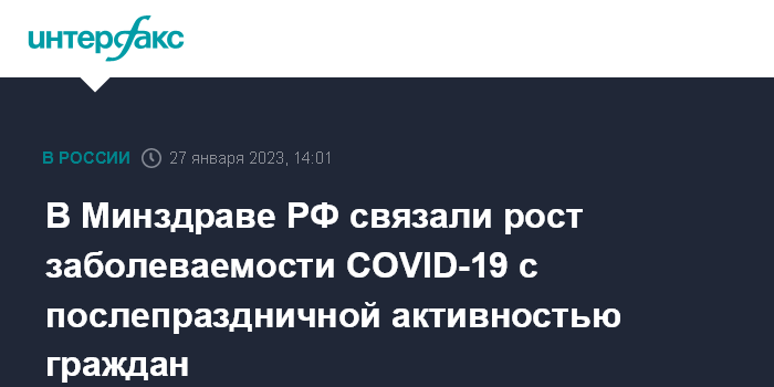 Москва. 27 января. INTERFAX.RU - В России во второй половине января 2023 года фиксируется рост заболеваемости COVID-19, наиболее вероятно, что он связан с возобновлением социальной активности граждан после новогодних праздников, сказал "Интерфаксу" главный внештатный специалист Минздрава России по инфекционным болезням Владимир Чуланов.