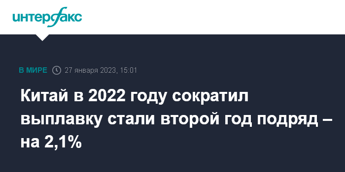 Москва. 27 января. INTERFAX.RU - Китай в 2022 году снизил выплавку стали по итогам второго года подряд.